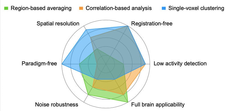 Unlike standard techniques that rely on predefined brain atlases or experimental conditions, single-voxel clustering allows for paradigm-free investigations, making it particularly useful for studying naturalistic behaviors and complex cognitive processes.