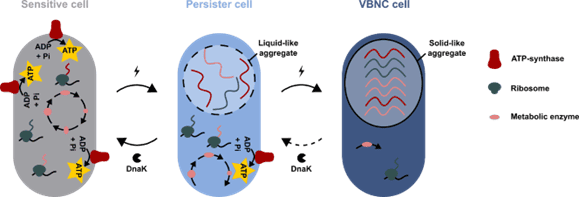 “There are different states of dormancy,” explains Prof. Jan Michiels. “The bacteria first enter a persister state, where metabolism slows down and energy-related proteins start to form condensates, but they still show some activity, akin to a sleeping state. However, if the stress lasts, the protein droplets solidify and the bacteria transition into the VBNC state. In this state, metabolism drops even further, and it takes the bacteria longer to become active again, resembling more of a coma.”